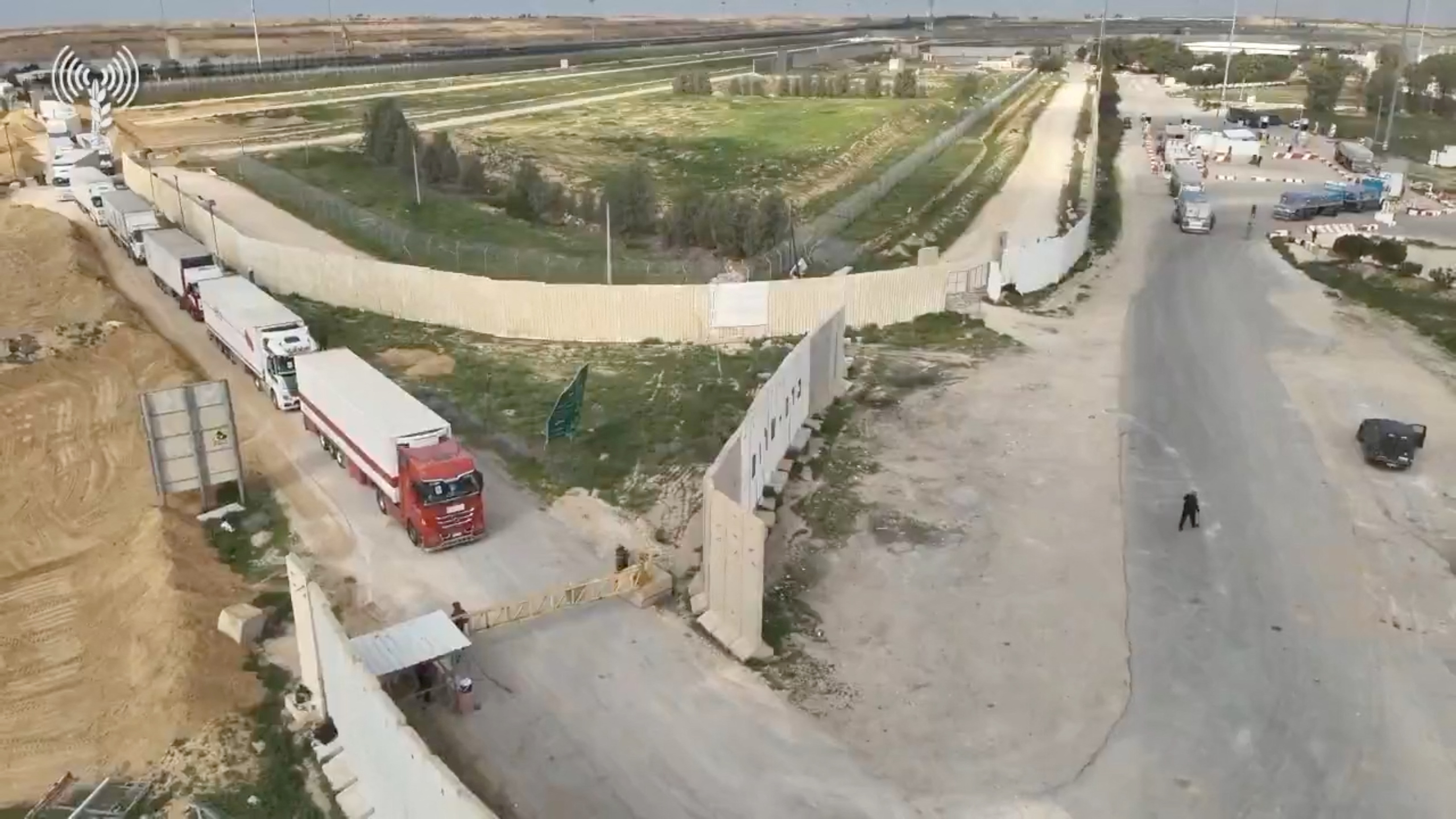 人道主义援助卡车在克雷姆沙隆过境点排队等待检查,这是以色列和巴勒斯坦伊斯兰组织哈马斯之间持续冲突的一部分,该过境点位于以色列、加沙和埃及之间的边界,这是从2023年12月12日发布的视频截图。 COGAT通过… 阅读更多