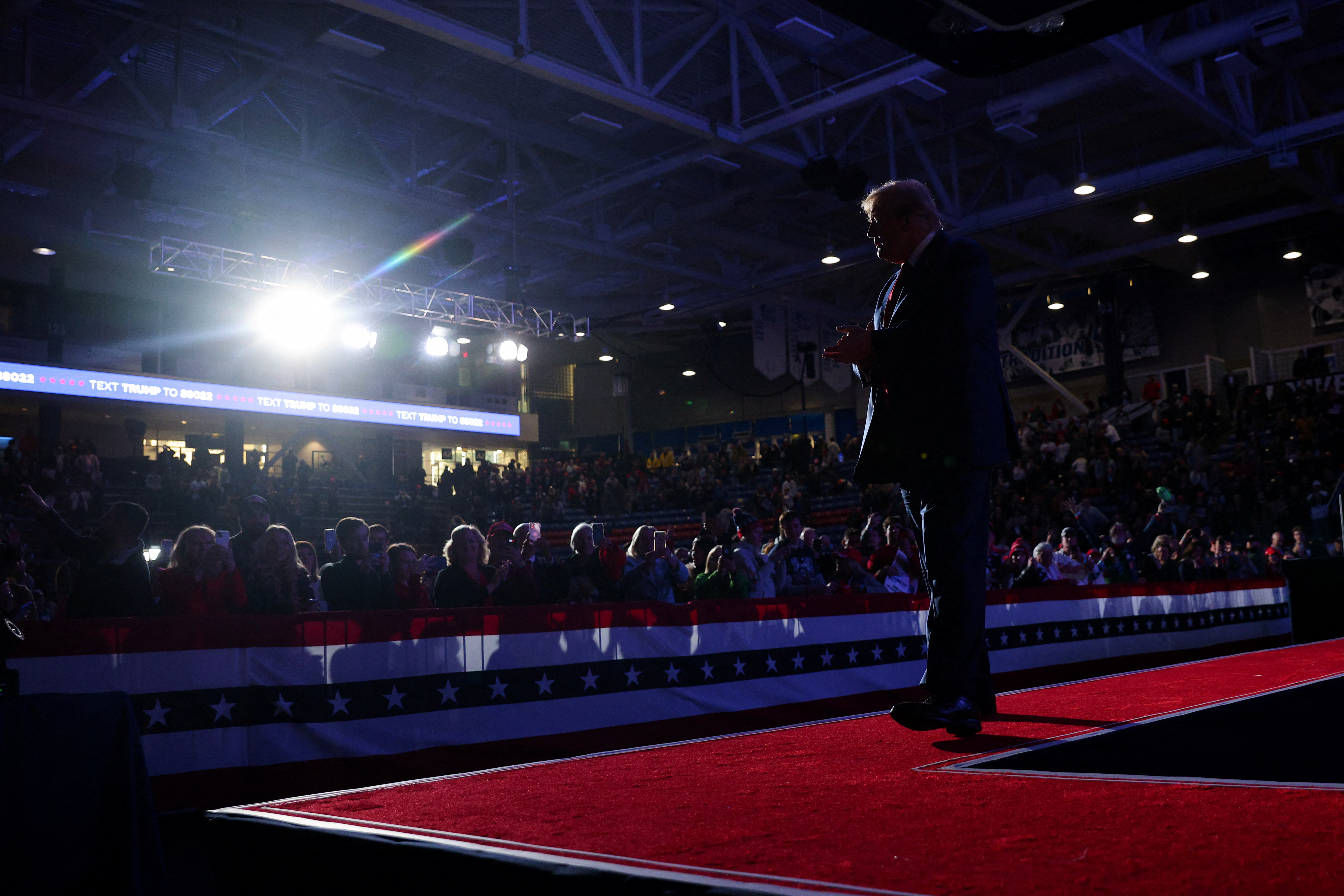 共和党总统候选人、前美国总统唐纳德·特朗普在2023年12月16日美国新罕布什尔州杜勒姆的一次集会上发表讲话。路透社/Brian Snyder摄