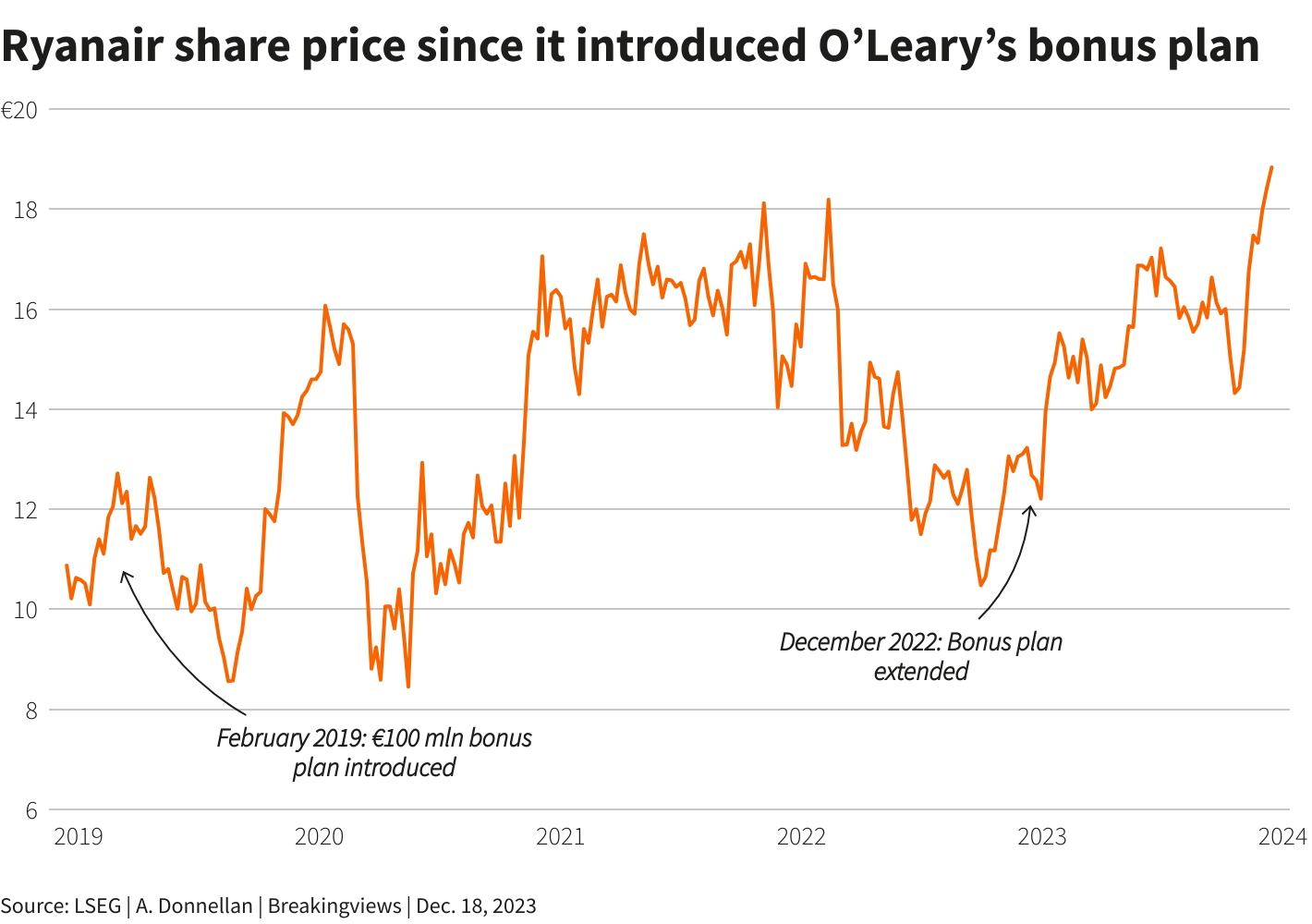 伦敦,12月18日(路透社Breakingviews)- 迈克尔·奥利瑞正朝着薪酬天堂飞去。回到2019年,瑞安航空公司(RYA.I)首席执行官的新长期奖金计划宣称可以获得1亿欧元的奖金,看起来非常有可能实现。这一奖励水平与这家价值210亿欧元的公司与下属员工的薪酬纠纷历史格格不入。但这家廉价航空公司的董事会也为使事情变得更加尴尬做出了自己的努力。 可能 。原本,奥利瑞只有在航空公司股价连续28天达到21欧元,或者实现22亿欧元的年度税前利润时才能获得最高奖金。LSEG数据显示,2024年这两个目标都有可能实现,因为股价已经达到19欧元。