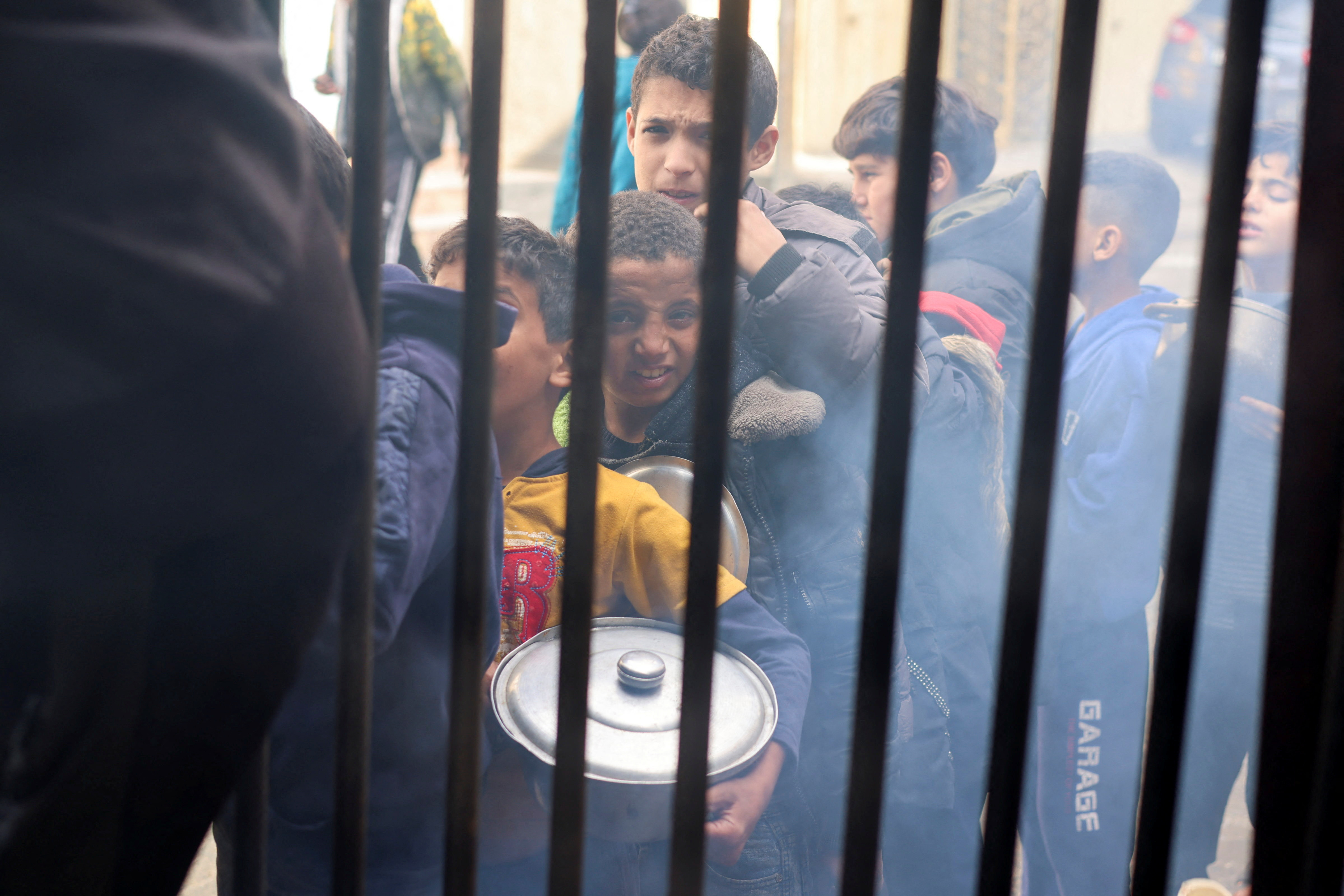 巴勒斯坦儿童排队领取慈善厨房烹饪的食物,由于以色列和哈马斯之间的冲突持续,食品供应短缺,这些孩子们背着锅,摄于12月14日,摄影师:REUTERS/Saleh Salem