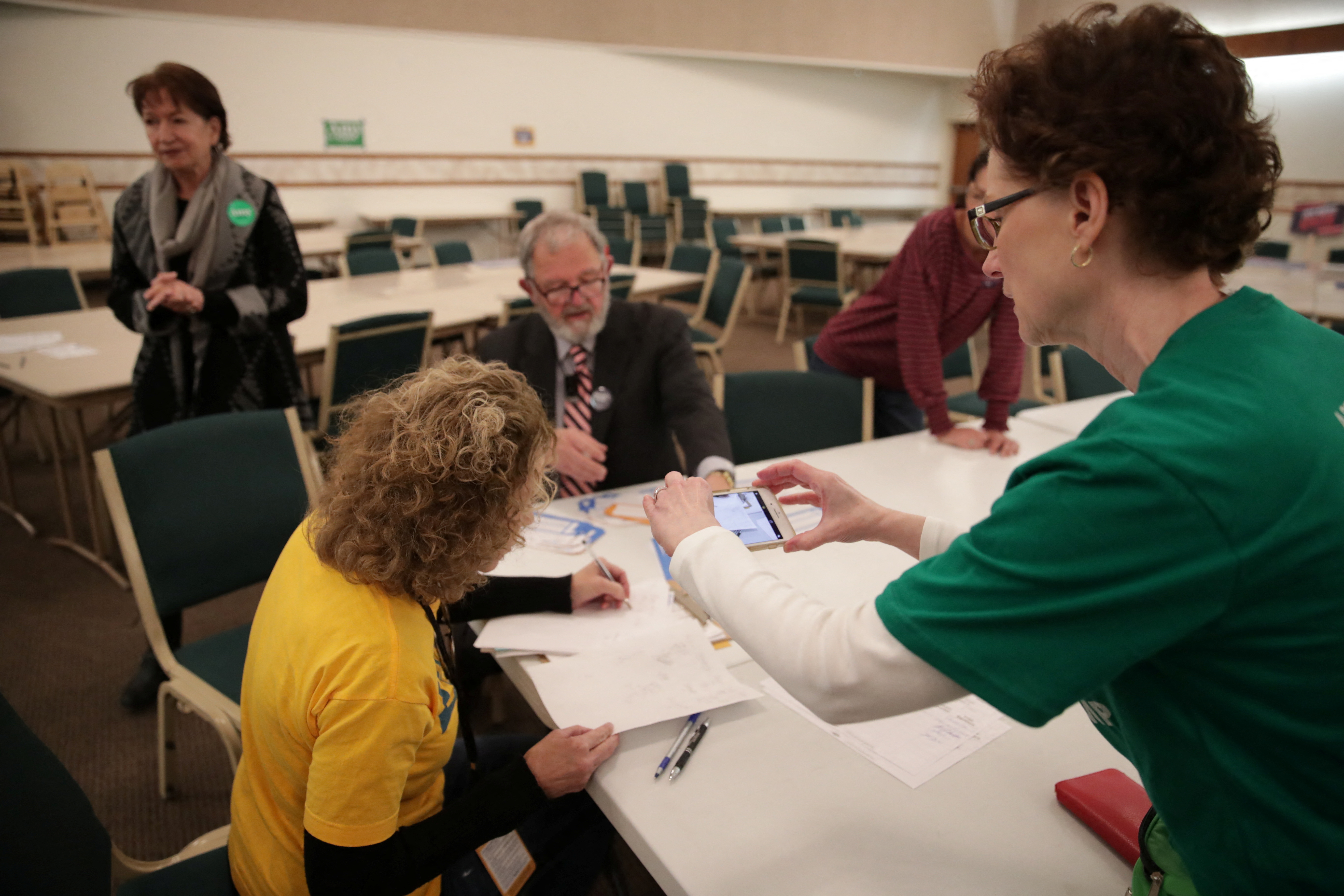 一个选区工作人员在爱荷华州西得梅因市的西得梅因基督教教堂进行民主党总统初选后,用手机记录选票计数过程。照片拍摄于2020年2月3日。美国爱荷华州西得梅因市,2020年2月3日拍摄。路透社/Jim Bourg/文件照片