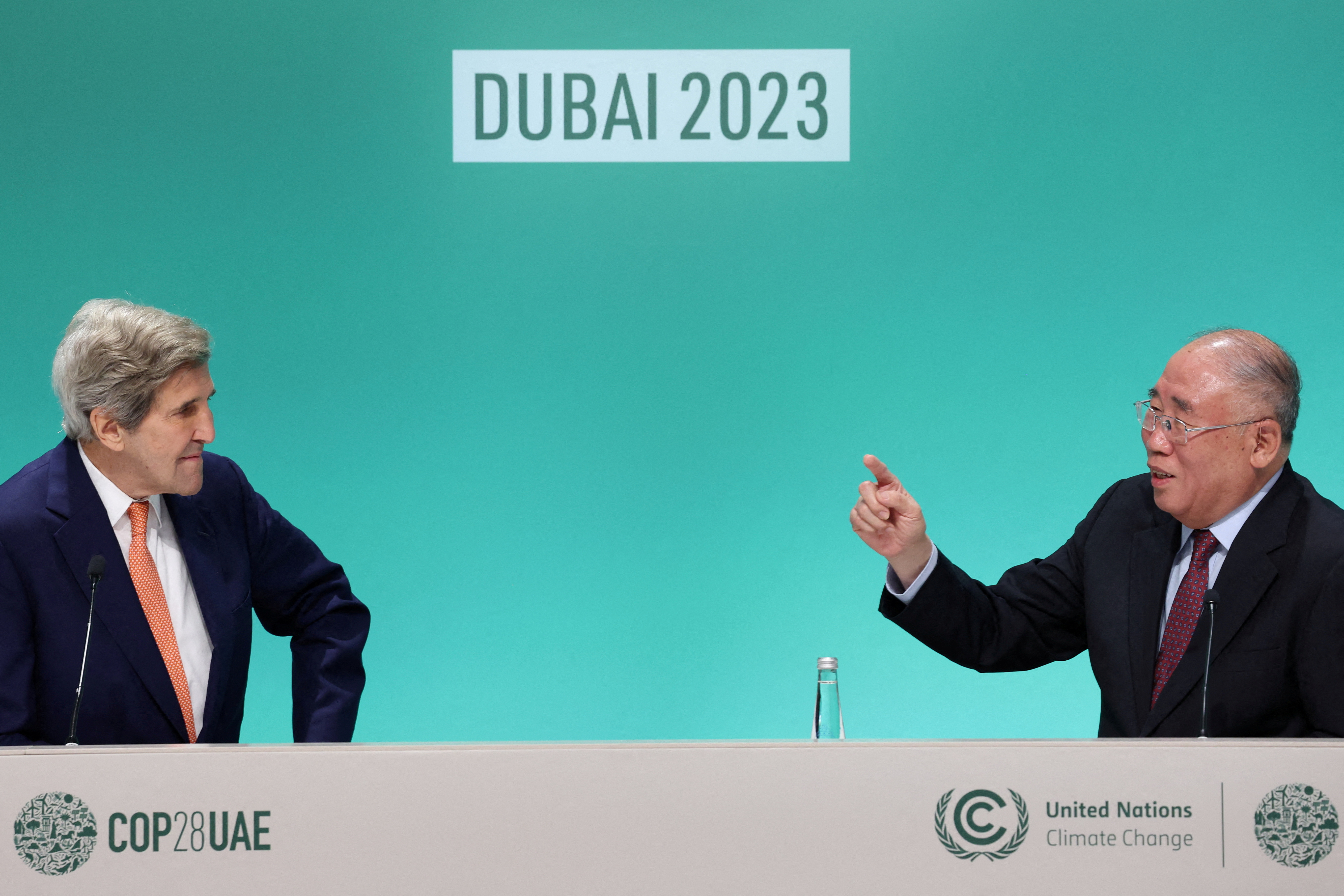 美国气候特使约翰·克里和中国气候特使解振华出席了联合国气候变化大会COP28在迪拜举行的新闻发布会,此前一份谈判协议草案已经发布,2023年12月13日,阿联酋迪拜。路透社/Amr Alfiky/文件照片