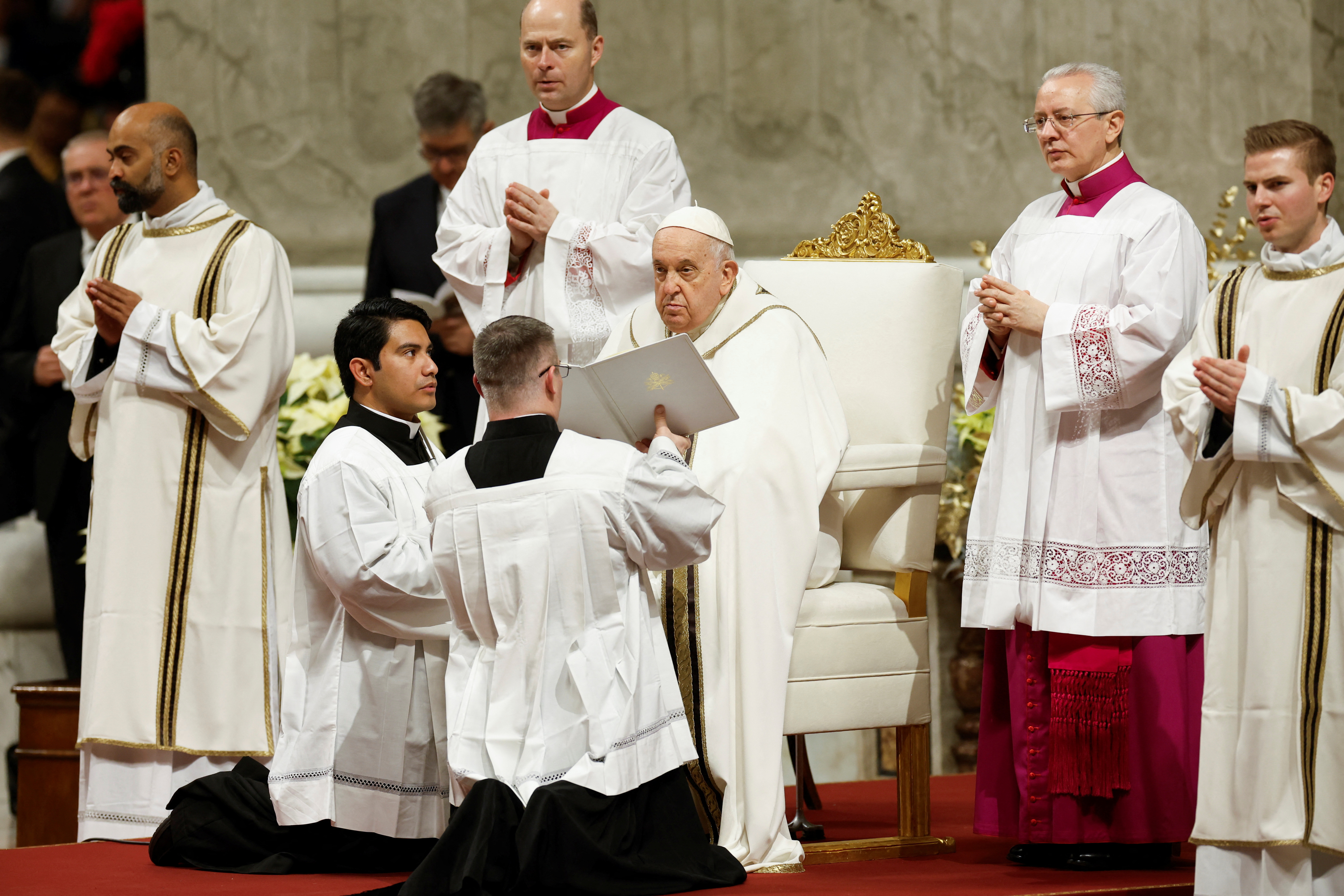 教宗方济各在梵蒂冈圣彼得大教堂庆祝2023年12月24日的圣诞夜弥撒。路透社/雷莫·卡西利摄