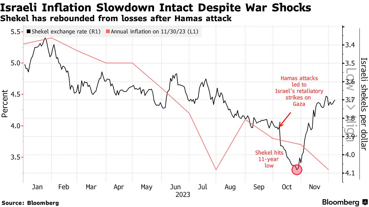 这一决定表明,由总裁阿米尔·亚伦领导的决策者们优先支持经济,这是在哈马斯于10月7日发动袭击后努力稳定市场之后的变化。随着通胀放缓,当地资产收回了损失,以色列谢克尔在过去两个月中对美元实现了世界上最大的涨幅,涨幅超过12%。