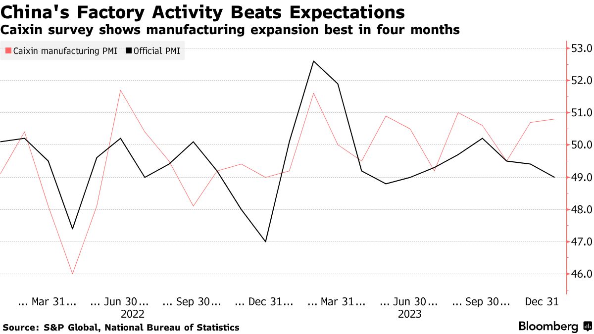 中国制造业的私人活动指数在12月份扩张得比预期更多,与官方数据形成对比,这表明经济在2023年末寻找增长动力。