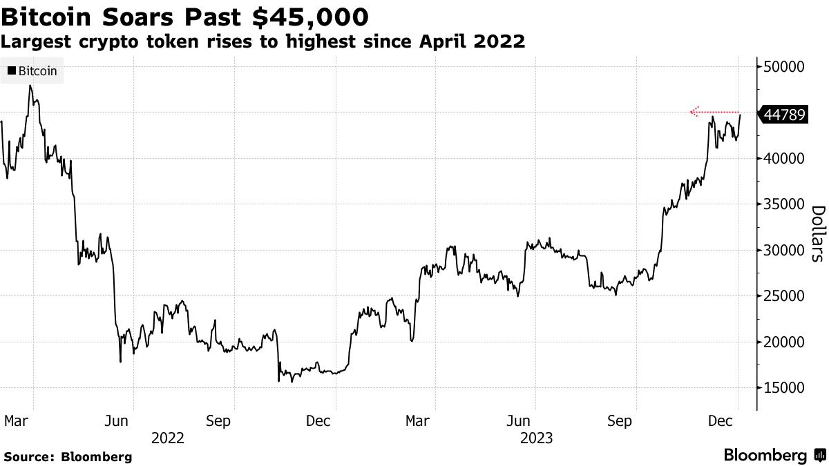 比特币(BTC USD)上涨至45000美元以上,创下自2022年以来的最高点,因ETF获批的希望-彭博社