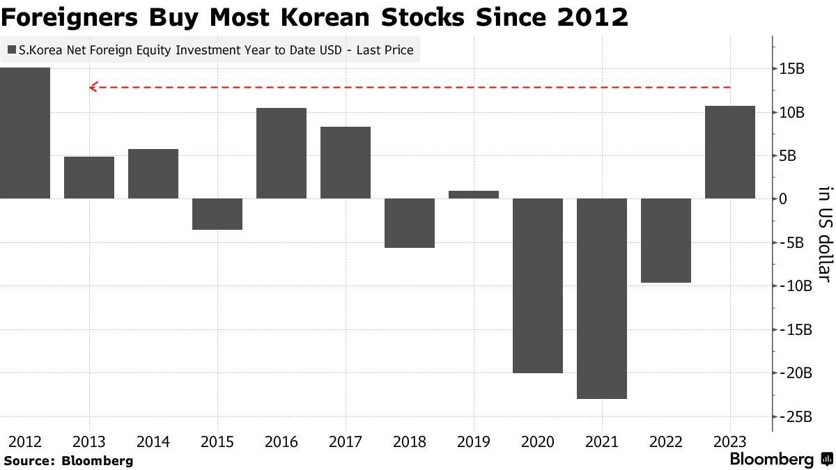 韩国股市的这一里程碑是在该国于去年11月初禁止本国股票的卖空交易之后出现的,自该禁令实施以来,该指数已上涨超过10%。监管机构正在努力根除裸卖空交易——这是在韩国非法的一种不借股票就卖出的做法。随着对美联储在2024年降息的押注增加,这个以科技为主的新兴市场也受益于全球风险偏好的改善。
