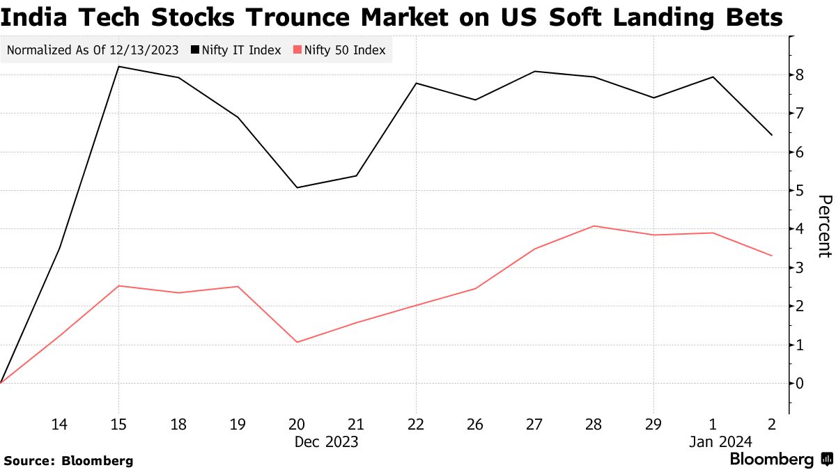 10家软件巨头的NSE Nifty IT指数自10月下旬以来飙升约17%,超过了NSE Nifty 50指数。尽管最初的涨势是由全球科技股的反弹推动的,但是美联储在12月的政策会议上的鸽派转变加速了这一涨势。