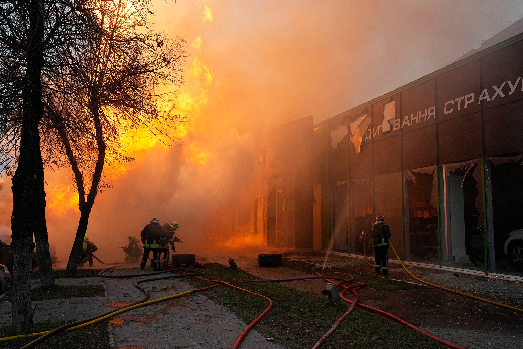消防员在乌克兰基辅一座被俄罗斯袭击摧毁的建筑物上扑灭火灾,日期为1月2日。