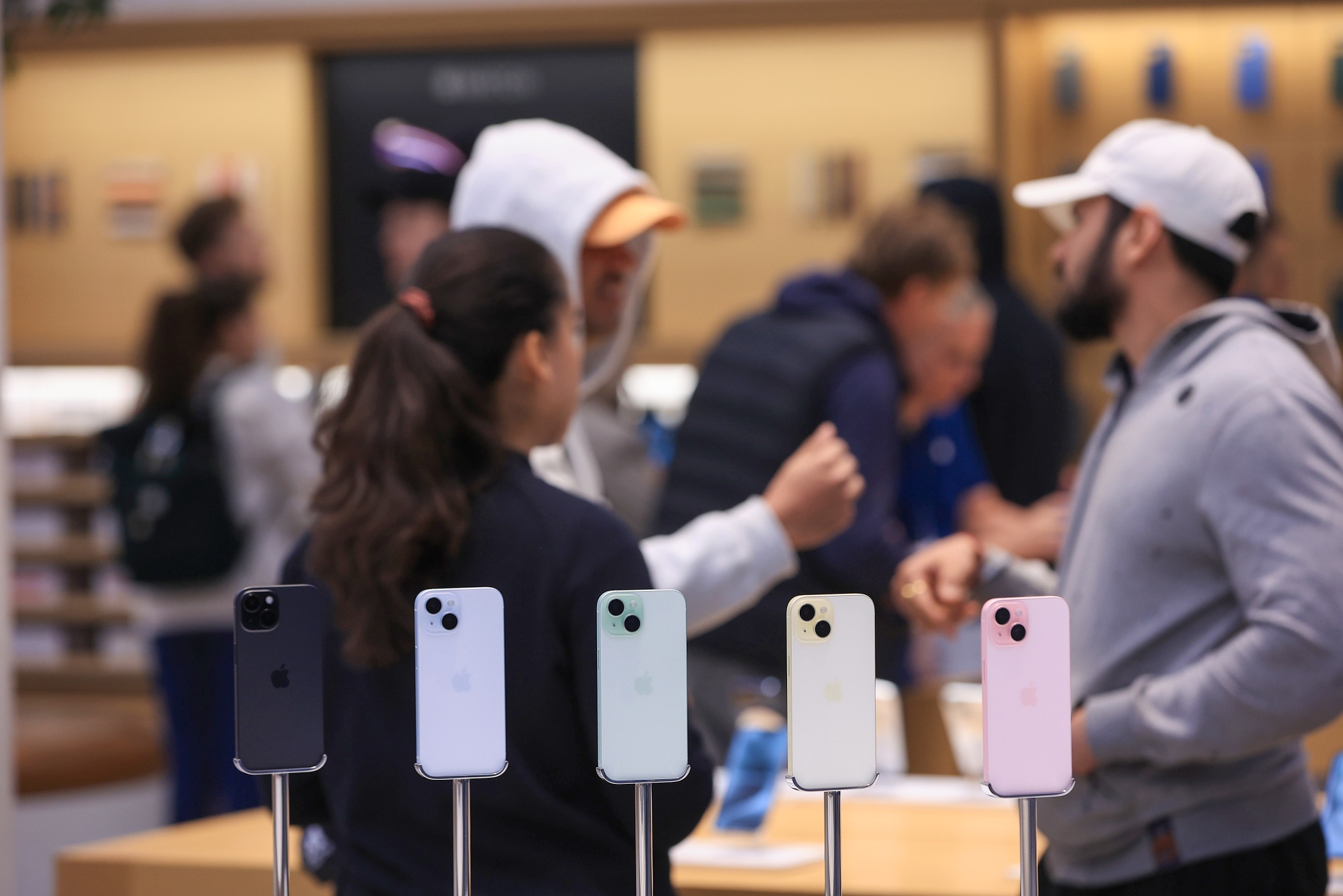 在德国柏林的苹果公司商店展示了新款 iPhone 15 智能手机。