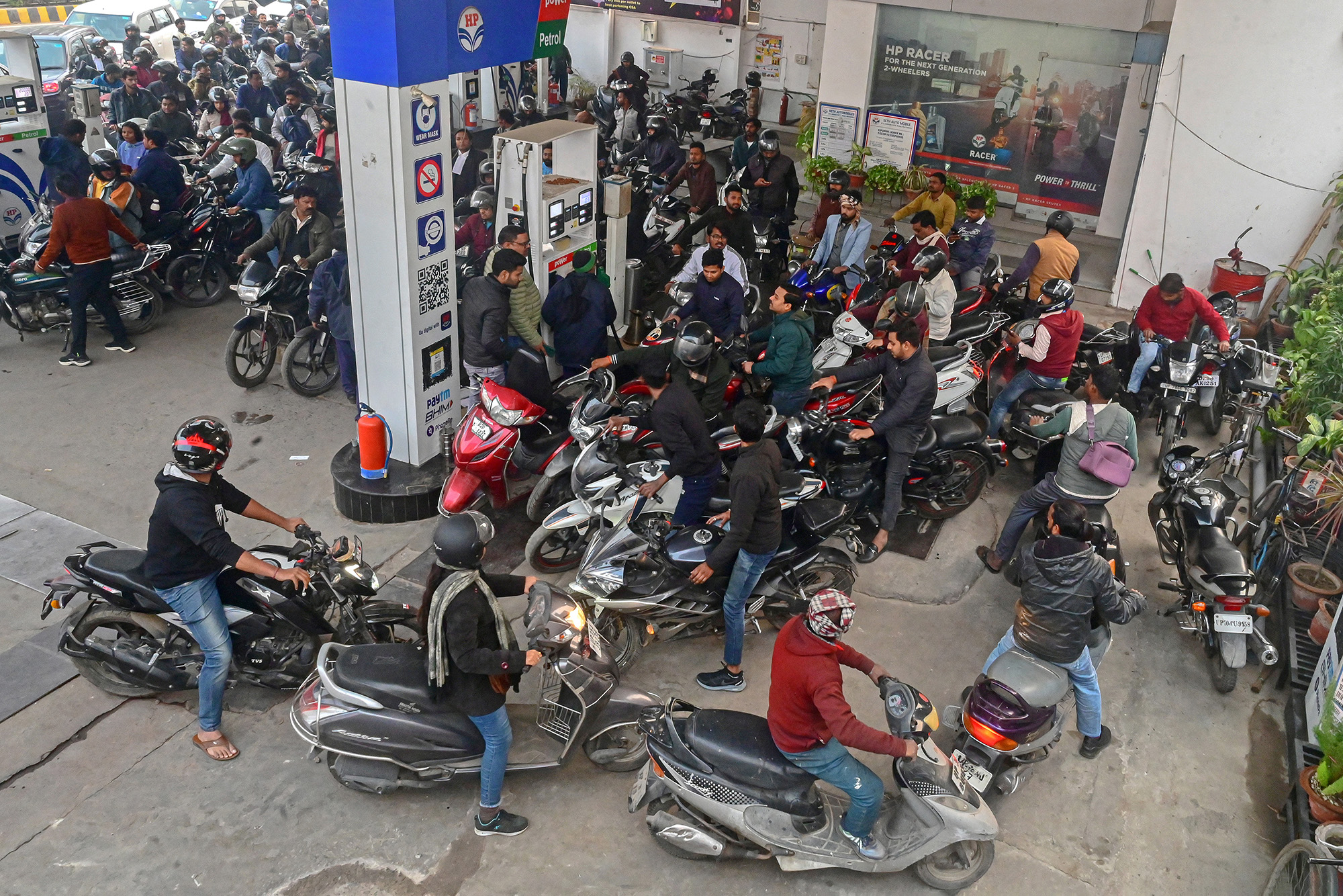 人们在印度Prayagraj的加油站等待加油,日期为1月2日。