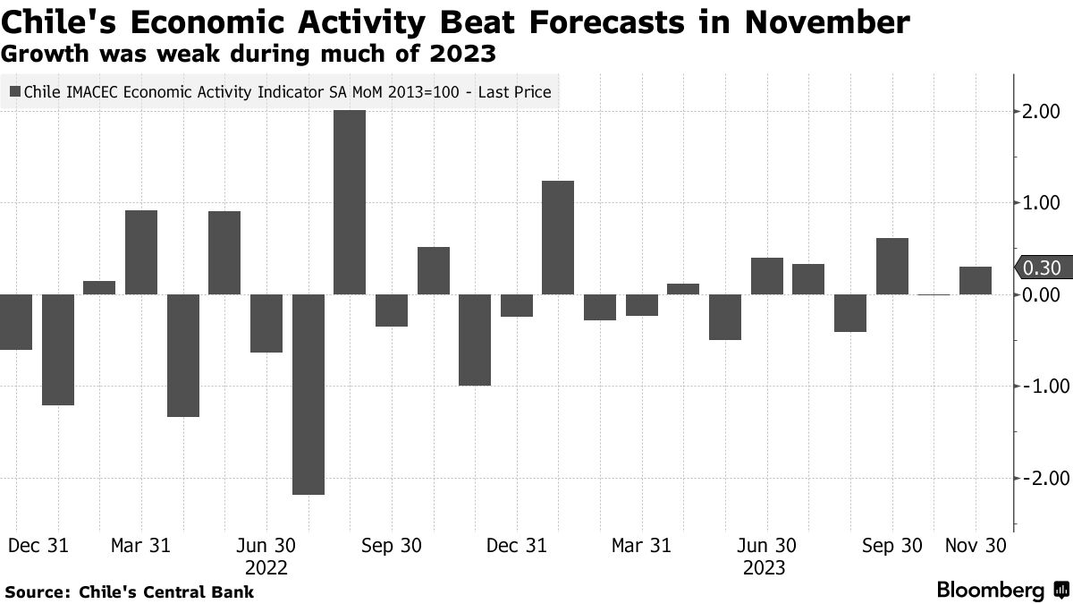 智利的经济活动在11月份扩张超出预期,得益于矿业和服务业的增长,支持总统加布里埃尔·博里克(Gabriel Boric)预测,2024年经济增长将在一年的停滞后出现反弹。