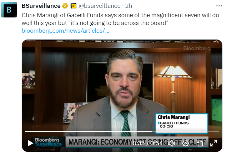 “去年,显然你买了七只股票,你做得很好,”Gamco Investors的Chris Marangi说。“今年可能会更难一些。这七巨头,其中一些可能今年表现不错。但不会是全面的,也不会像2023年那样。”