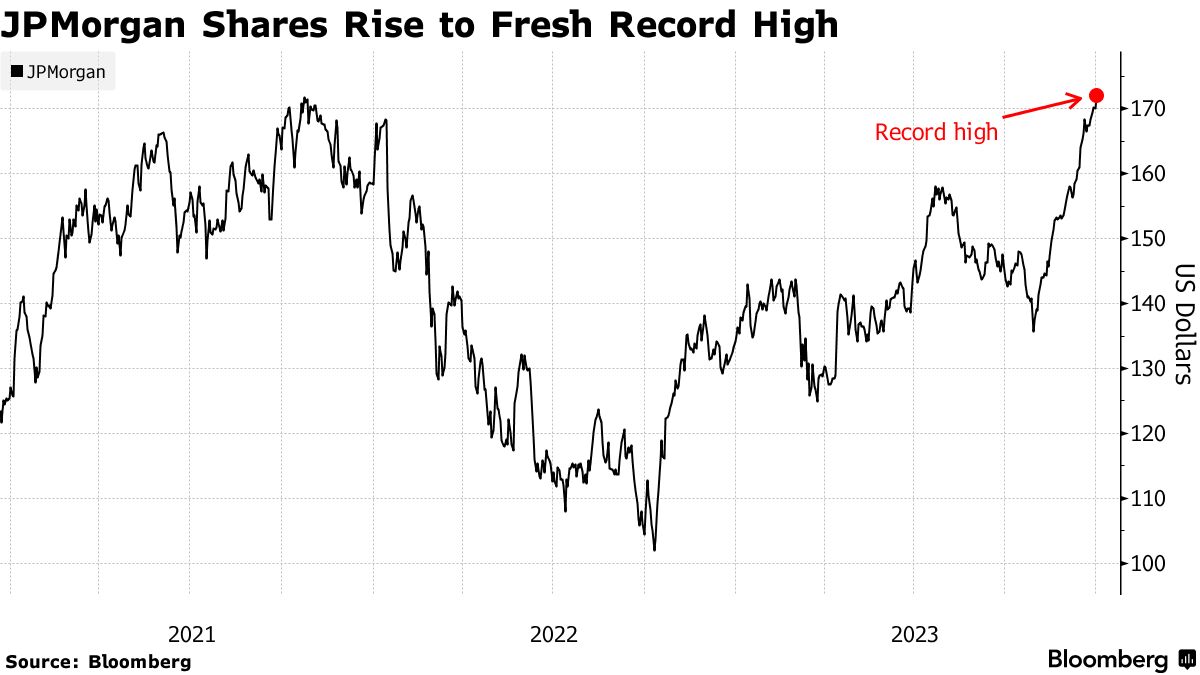 摩根大通股票(JPM)创历史新高,银行的涨势延续至2024年 - 彭博社