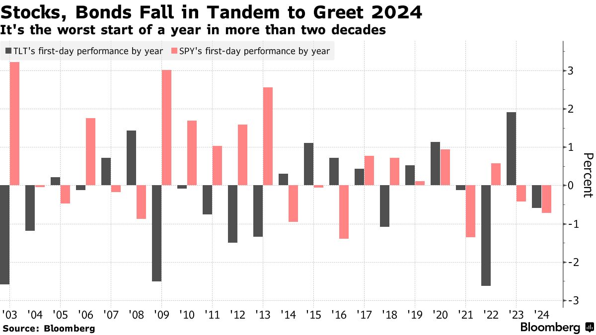 交易商们希望全球市场在年底能够延续之前的上涨势头,但在2024年的第一个交易日,出现了股票和债券市场同步大幅下跌,成为有史以来最糟糕的一次。