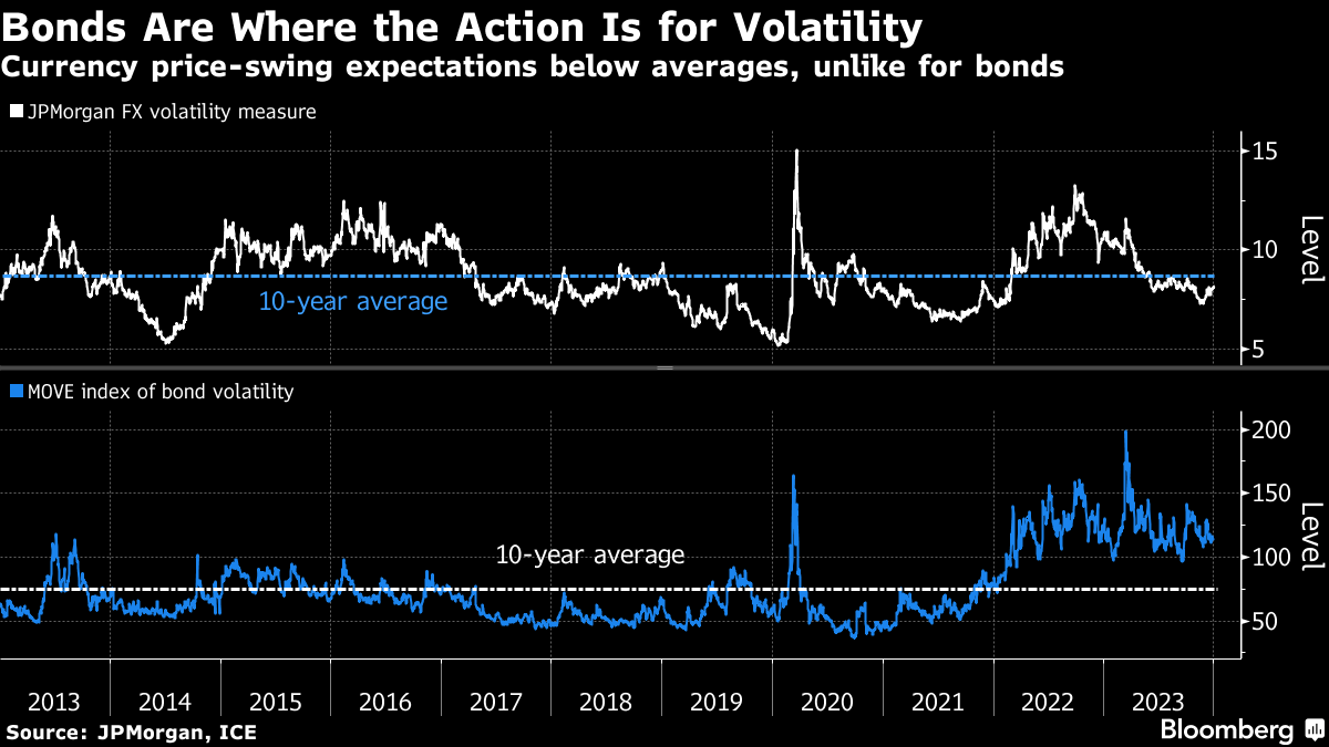 债券继续是市场的关键领域,因为各国央行在考虑如何结束这一代人以来最严重的全球紧缩周期。此外,议程上还包括何时开始至少部分逆转这些利率上调,以及以多快的速度这样做。ICE的预期国债波动指数已经连续两年高于其长期平均水平。与货币的对比突显了债券市场的动荡程度,摩根大通的隐含货币波动率指数去年中期跌破了其长期平均水平,随着各国央行加息放缓,外汇市场上出现了一定程度的平静。