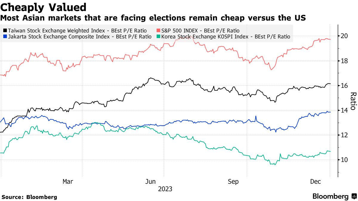 “韩国、台湾、印度尼西亚和印度都处于更好的位置来应对选举波动,”荷兰合作银行香港的亚太股票主管乔舒亚·克拉布说。“估值低于美国,这意味着预期更低,而印度尼西亚和印度也有更好的增长前景。”