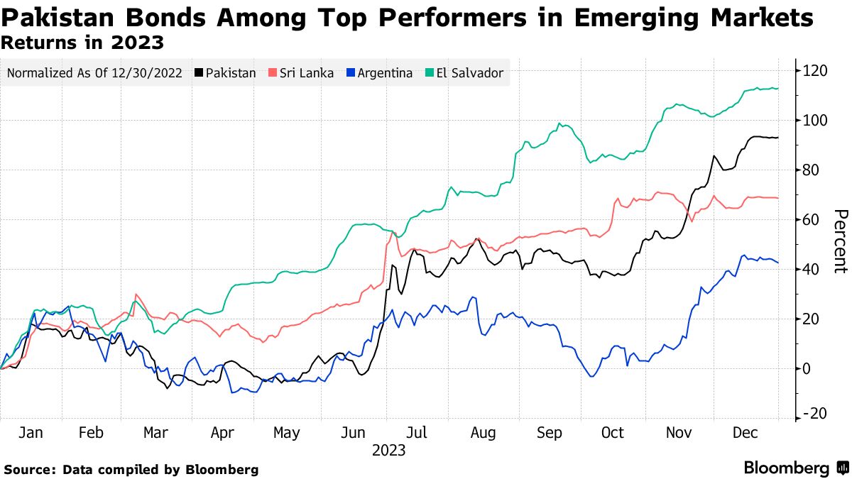 巴基斯坦美元债券的指数在2023年上涨了93%,仅次于萨尔瓦多在新兴市场中的表现。巴基斯坦可能会寻求从总部位于华盛顿的国际货币基金组织获得新贷款,以振兴其脆弱的经济,临时财政部长沙姆沙德·阿克塔尔在11月表示。