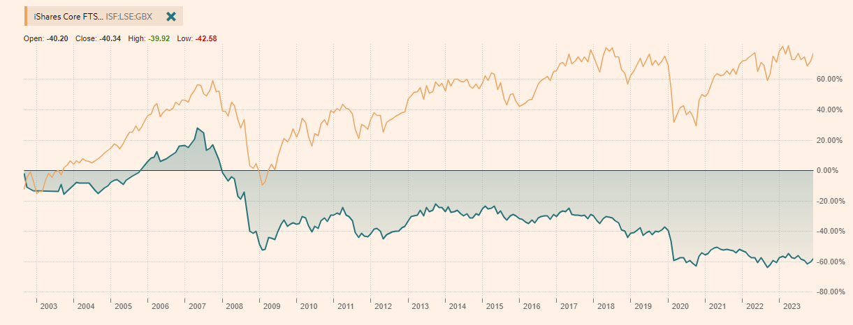 经过长时间的搜索,我在ft.com网站或彭博社上找不到富时30指数。然而,我找到了凤凰人寿管理的一只基金,该基金自2002年以来一直跟踪富时30指数。下面的图表中,它在FT上标为绿色。你可以在这里。黄线显示了一只跟踪富时100指数的基金的表现,以供比较: