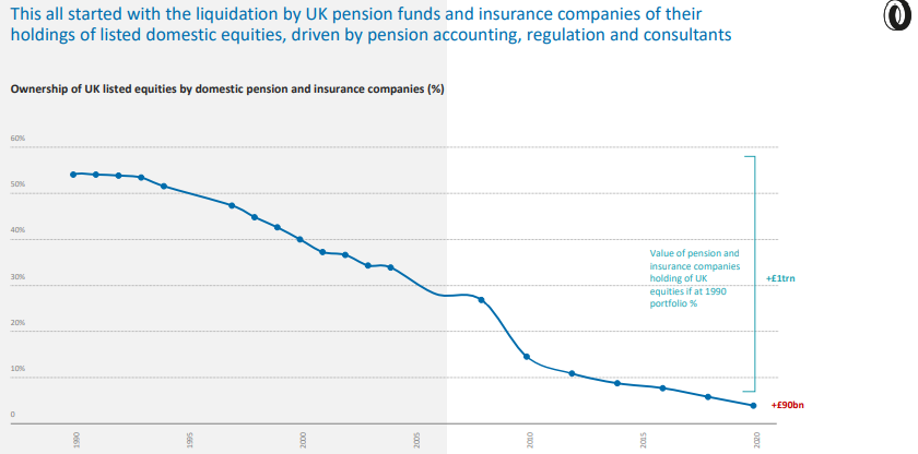 从1990年管理的养老金基金超过一半的资金,到现在股票仅占不到10%,这是一个惊人的减少,而股票在这段时间内通常表现良好。养老金基金以长期著称,这使它们能够大量投资股票,那么为什么它们放弃了股票呢?主要原因是向责任匹配的转变,这在20年前就开始认真进行,受到监管机构和投资银行的鼓励。由于许多确定福利养老金计划赤字,意味着它们的资产无法覆盖对养老金领取人的责任,它们开始购买债券,以便更接近保证收入。这帮助英国国债的表现甚至比美国国债更好。这也创造了一个循环,因为较低的债券收益使未来收入的保证变得更加昂贵,促使更多的债券购买和更低的收益率。这导致许多英国基金对利率保持低位进行衍生品投注,这种做法在2022年10月导致英国国债市场的崩溃。资深左翼经济评论家威尔·哈顿甚至 认为 他们已经迫使英国陷入“厄运循环”,并创造了一个“针对增长操纵的系统”。