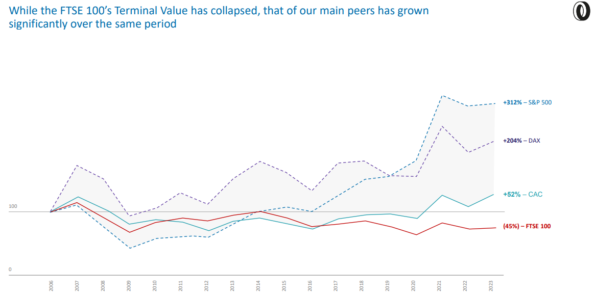 从英国的角度来看,这一轨迹令人非常失望。但这种痛苦的滞后是最近才出现的,大约在2008年全球金融危机后的三年左右。在2016年英国脱欧公投后,差距显著扩大,但把一切都归咎于离开欧盟太过简单;在那时,富时100指数已经连续几年表现糟糕。
