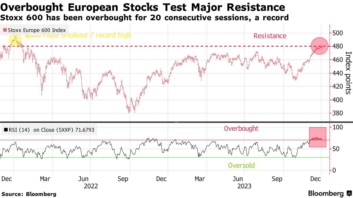 在过去的两个月里,欧洲斯托克600指数上涨了约10%,受到房地产股和科技股等利率敏感型行业的推动,此前美联储暗示其加息行动可能已经结束。欧洲的基准指数在年底收于2022年1月以来的最高水平,而德国的DAX指数在12月达到了历史最高水平。