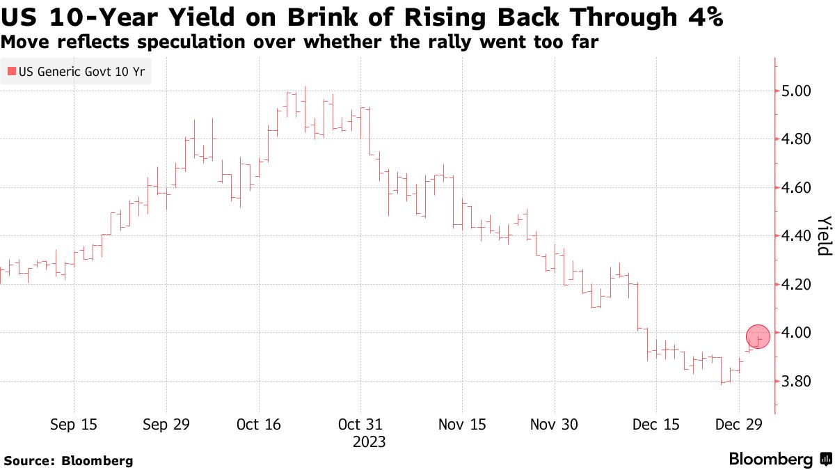 美国国债十年期收益率瞄准4%,债券在美国数据公布前下跌-彭博社