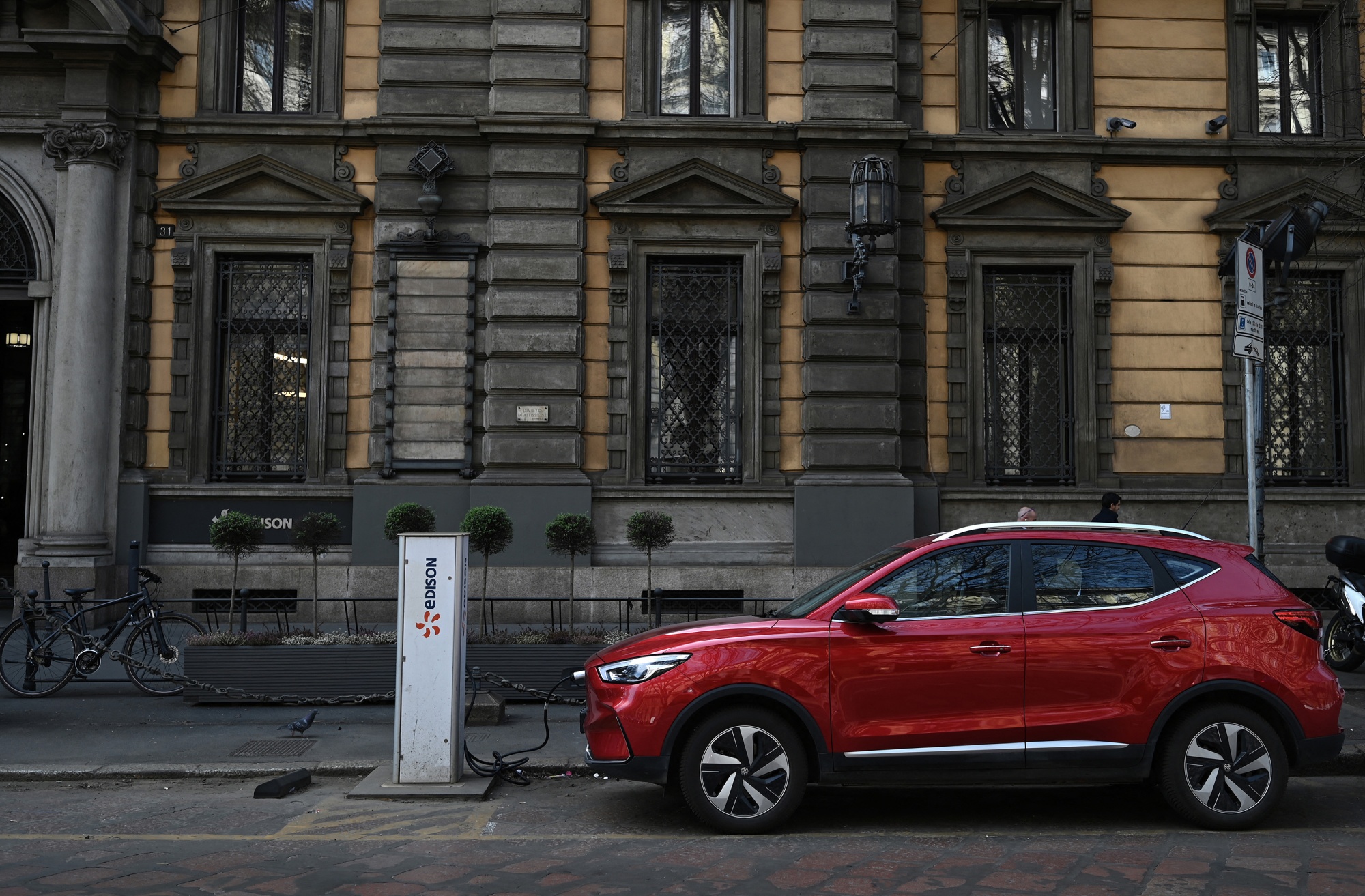一辆MG电动SUV在意大利米兰的一个充电站充电。