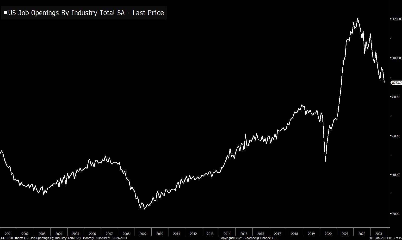 今天是JOLTS日。东部时间上午10点,预计数据将显示882万个职位空缺。一年前,这将是一个非常重要的事件,因为美联储当时高度关注职位空缺作为劳动力市场紧张程度的衡量标准。当然,在2023年,通货膨胀大大减缓,观点已经改变。尽管如此,总的空缺仍远高于COVID前的水平。