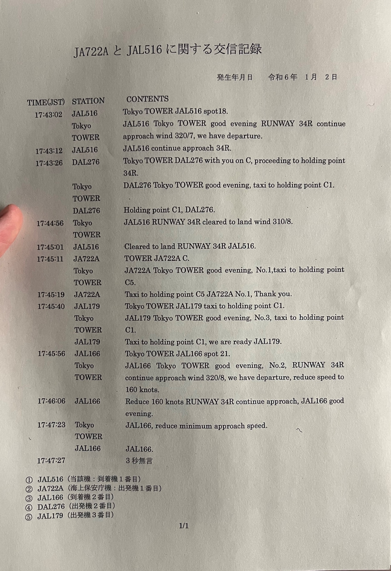 根据记录,飞行机组回应说:“滑行至C5号等待点JA722A No. 1,谢谢。”官员在新闻发布会上表示,尚未确认是机长还是他在事故中身亡的副驾驶员与塔台进行通讯。