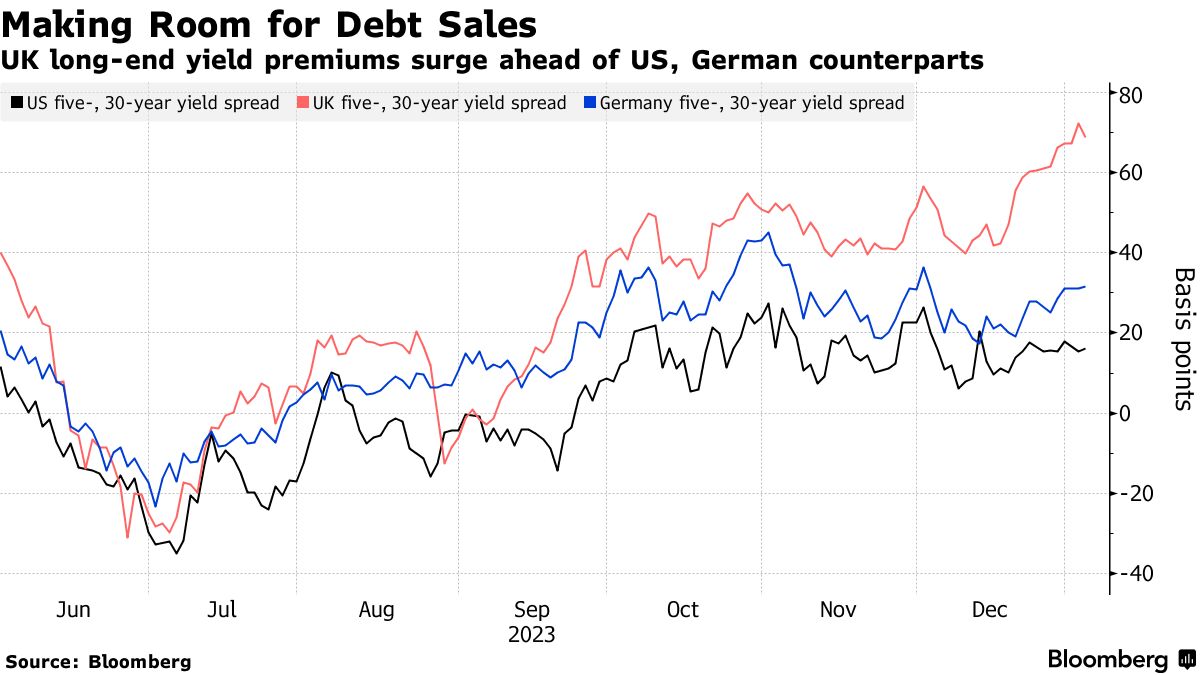 英国政府30年期国债的收益率在新年的头两个交易日上升了14个基点,超过了美国和德国的同类债券。这些债券也表现不佳,使得其收益率溢价超过五年期国债的溢价达到了近一年半以来的最高水平。