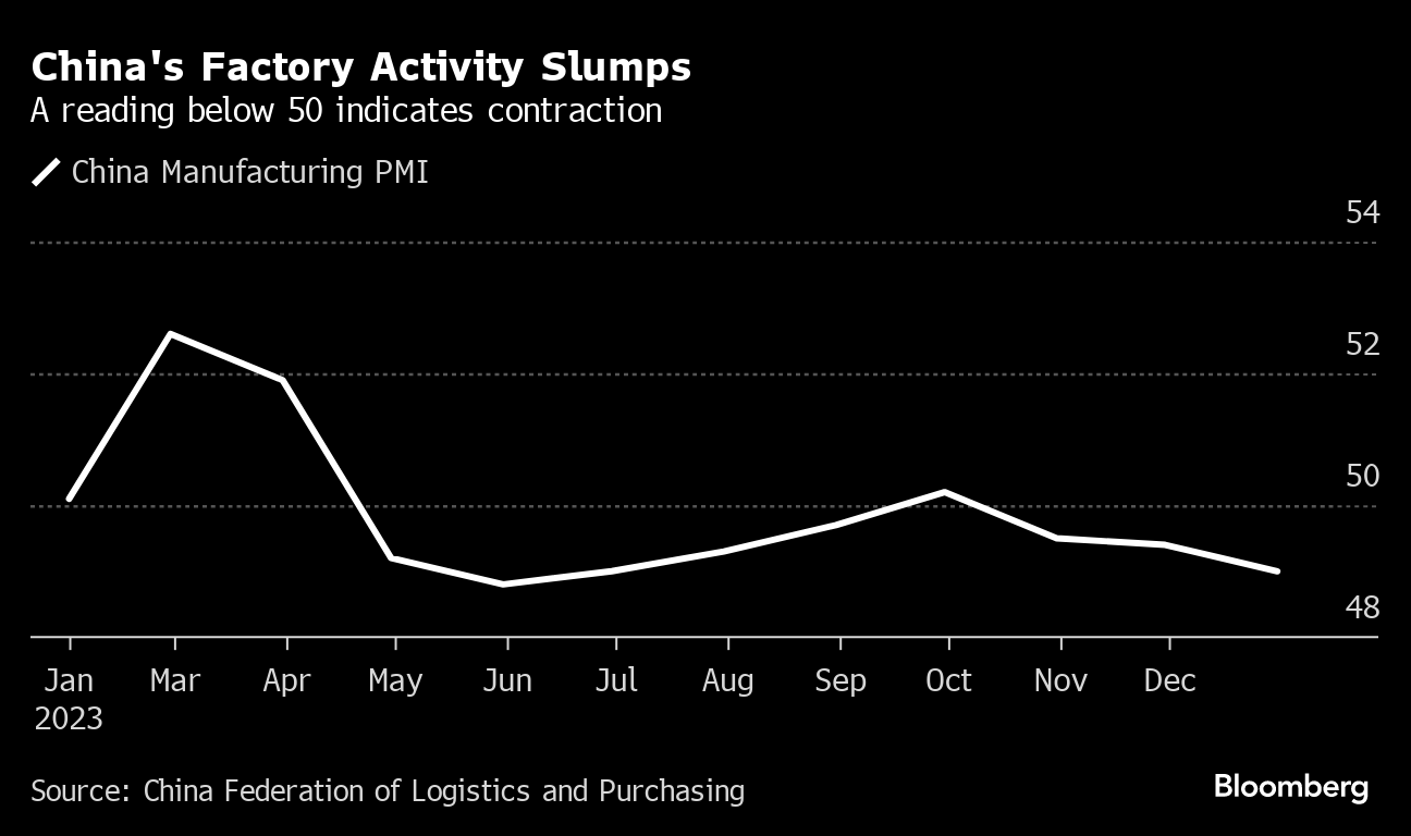 最新的制造业指标表明,中国制造商的前景仍然脆弱:官方采购经理人指数在上周末公布的数据显示,12月份下降至六个月来的最低水平。澳新银行集团援引调查指出,由于订单下降,企业已经开始降低销售价格,这增加了通货紧缩风险,并需要政府提供更多刺激措施。