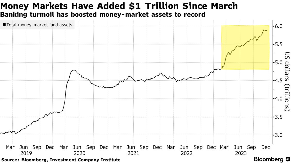 但即使标普500指数接近历史高位,由于越来越多的人相信美联储明年将降息,货币市场基金仍然持续吸引着大量资金流入,而这些资金的来源很重要。在3月银行业动荡之前,存款已经开始流出银行,转而投向收益更高的投资工具,因为美联储的加息周期推高了短期票据的利率。这种动态在此后的几个月里只变得更加强烈。