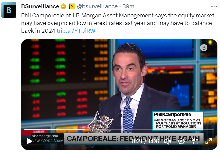 目前,市场的抛售更多是噪音,而不是其他任何东西,据摩根大通资产管理公司的菲尔·坎波雷尔称。尽管一些波动可能会持续,坎波雷尔仍然认为这将是股票持有者的好年份,主要是由于持续的美国经济增长和持续的通货紧缩。他说,他现在将股票配置超配了7% —— 这是自2022年联邦储备加息周期开始以来最多的。