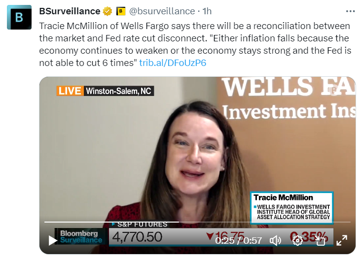 “我们认为,要么通胀下降是因为经济继续疲弱,要么经济保持强劲,而联邦储备委员会无法降息六次,”麦克米利恩说。“因此,在我们经历这个调整过程时,我们认为这可能会对利率施加一些上行压力,并对股票市场施加一些下行压力。”