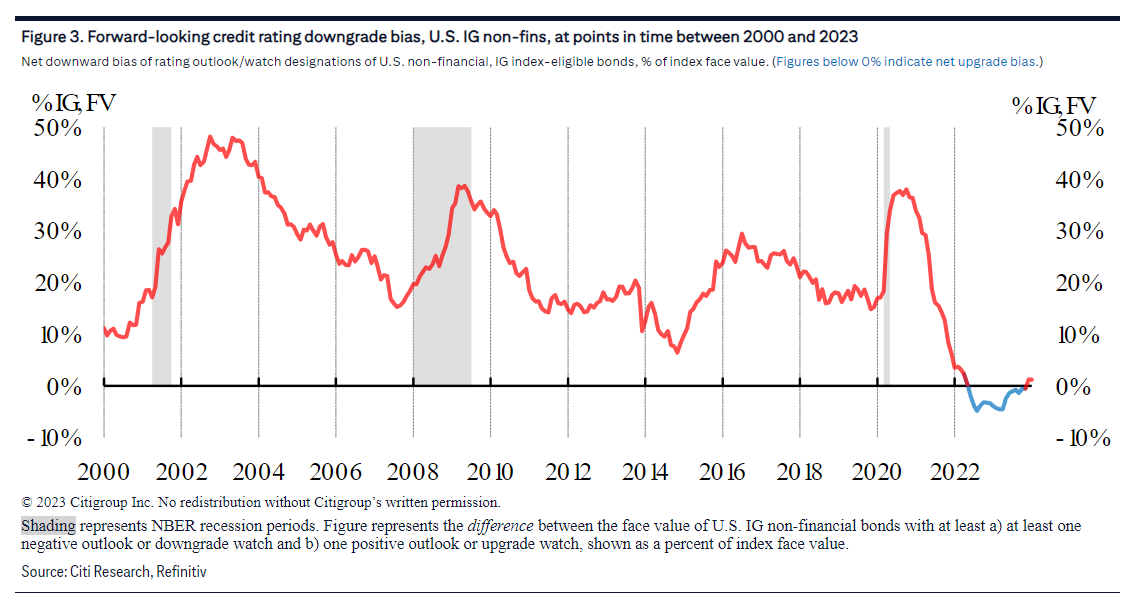 当然,评级机构并不总是在将公司的评级列入观察后实际进行变更。即使他们这样做,他们也是从极低的降级偏见开始。正如花旗所指出的:“我们的美国经济团队预测,在衰退开始前六个月,美国投资级非金融企业的前瞻性评级偏见从未如此强烈。”