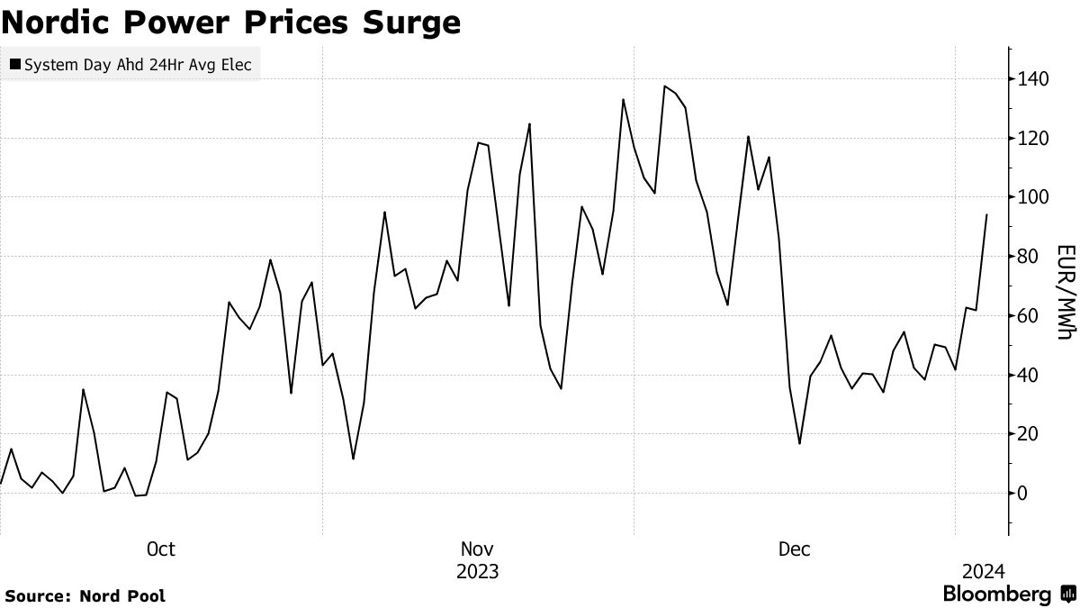 北欧地区的日前电力价格飙升至自12月13日以来的最高水平,跃升53%,达到每兆瓦时94.25欧元在 Nord Pool 交易所。