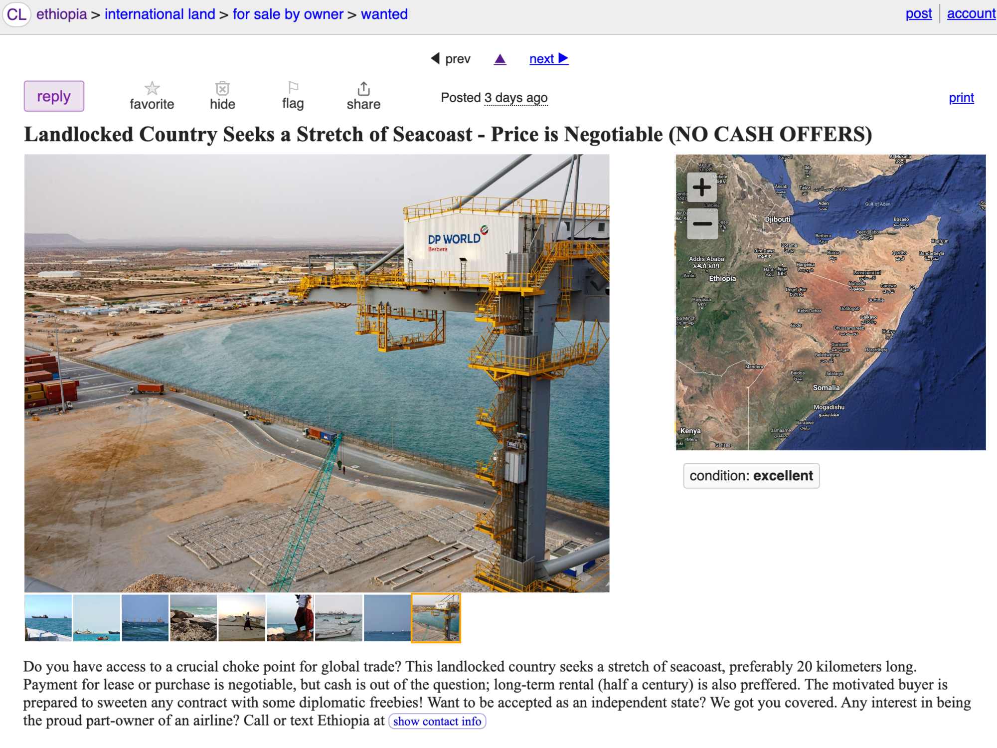 如果埃塞俄比亚——世界上最大的没有海洋通道的国家——发布了一则Craigslist的“求购”广告,寻找一片海岸土地,Javier Blas 想象会是这个样子:“内陆国家寻求一片海岸线;租赁或购买的付款是可以商量的,但现金是不可能的;有动力的买家准备用一些赠品来增加合同的吸引力。”我擅自在一则二手丰田Corolla的广告上进行了一些检查元素,然后,瞧,埃塞俄比亚的求助: