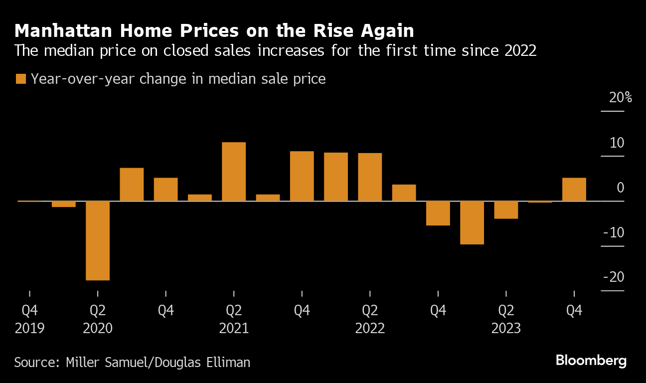 曼哈顿的住房价格上涨首次超过一年,受到高端销售的推动。根据评估师米勒·塞缪尔和经纪公司道格拉斯·埃利曼的数据,第四季度的成交价中位数为116万美元,比一年前上涨了5.1%。销售额在500万美元以上的房屋激增,超过三分之二的买家付现金,这是自2014年米勒·塞缪尔开始追踪这一指标以来的最高比例。