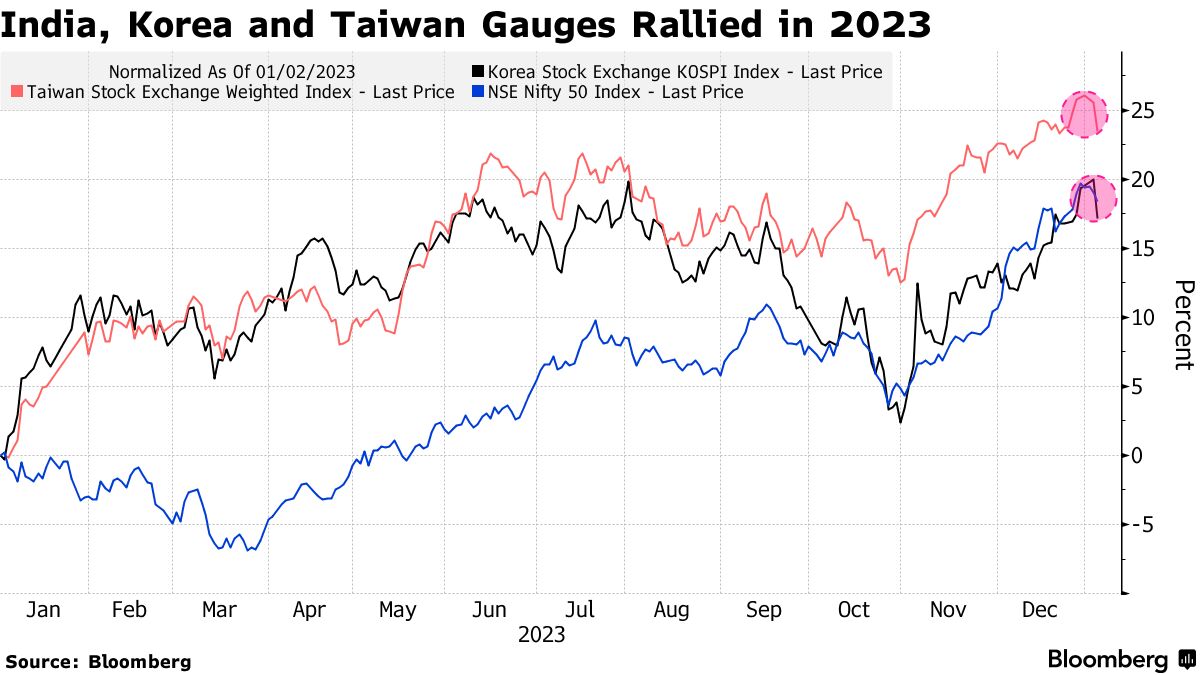 印度、韩国和台湾的两位数涨幅将受到选举结果的考验。在日本,央行可能的转向将决定出口商股票指数在经历了自2013年以来的最佳年度后的表现。