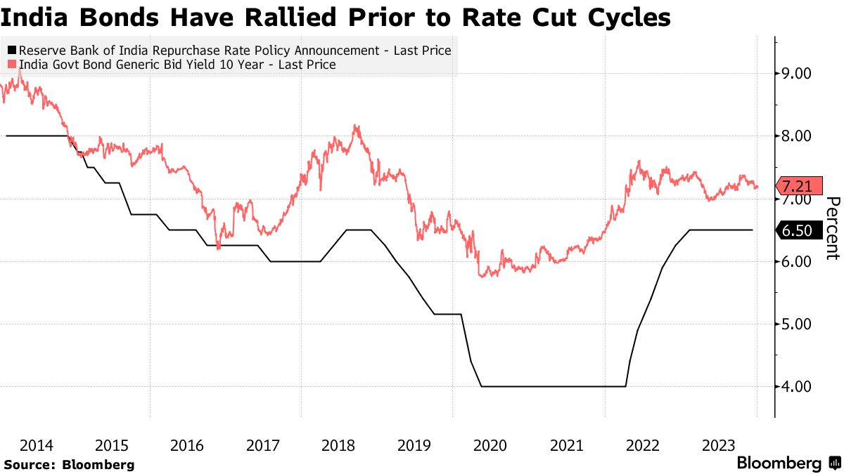 高盛集团表示,印度储备银行预计会在预期之前开始降息,以应对美联储加速的宽松周期。ICICI直接研究指出,印度储备银行之前两次降息周期表明政府债券的涨势先于实际降息。
