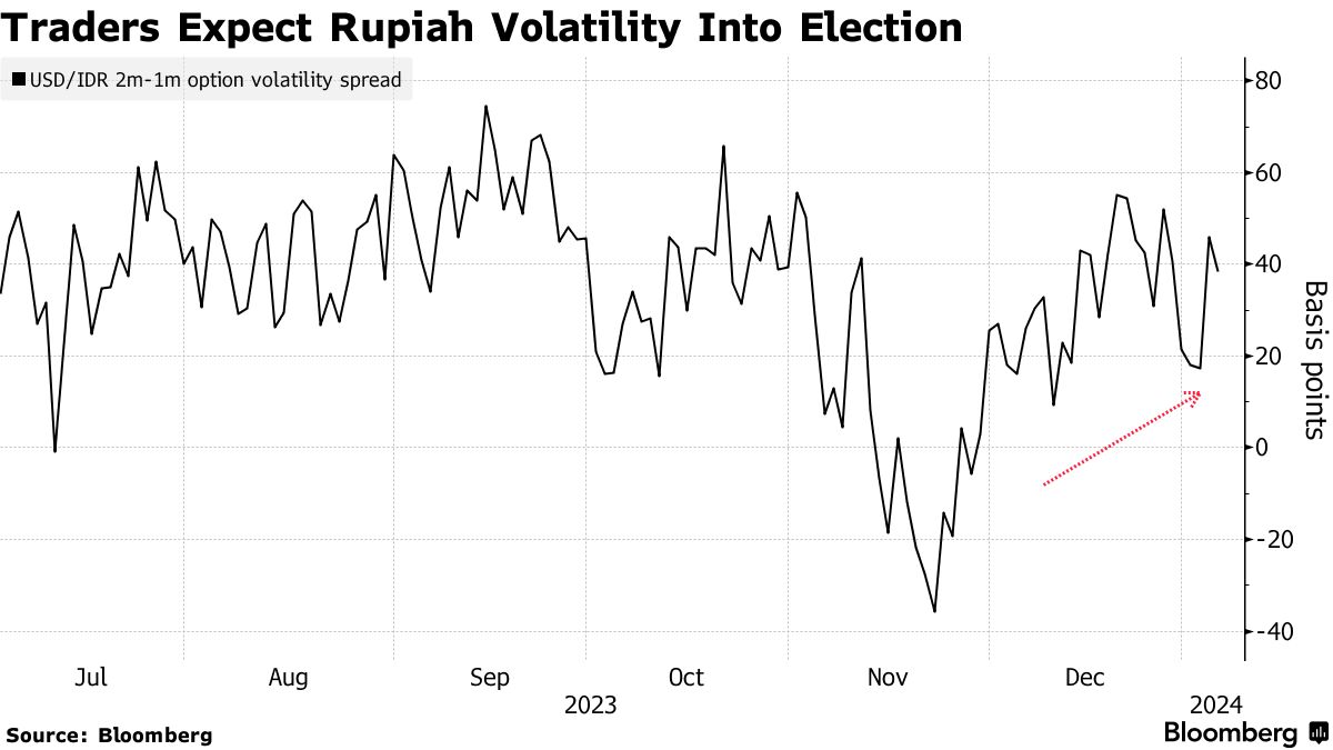 台湾元在未来两周的预期波动指数(现在包括1月13日的总统选举)本周跃升至一年多来的最高水平。在2月份类似选举之前,印尼卢比的预期波动指数也在上升。