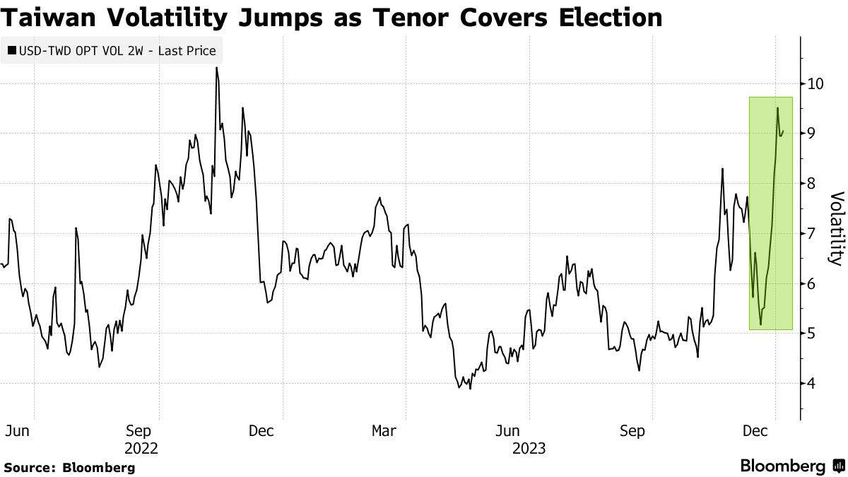 台湾元的两周期权波动率于1月1日攀升至9.5 vol,为自2022年12月以来的最高水平,远高于12月19日之前的5.2水平,此时期权已包含1月13日的投票。