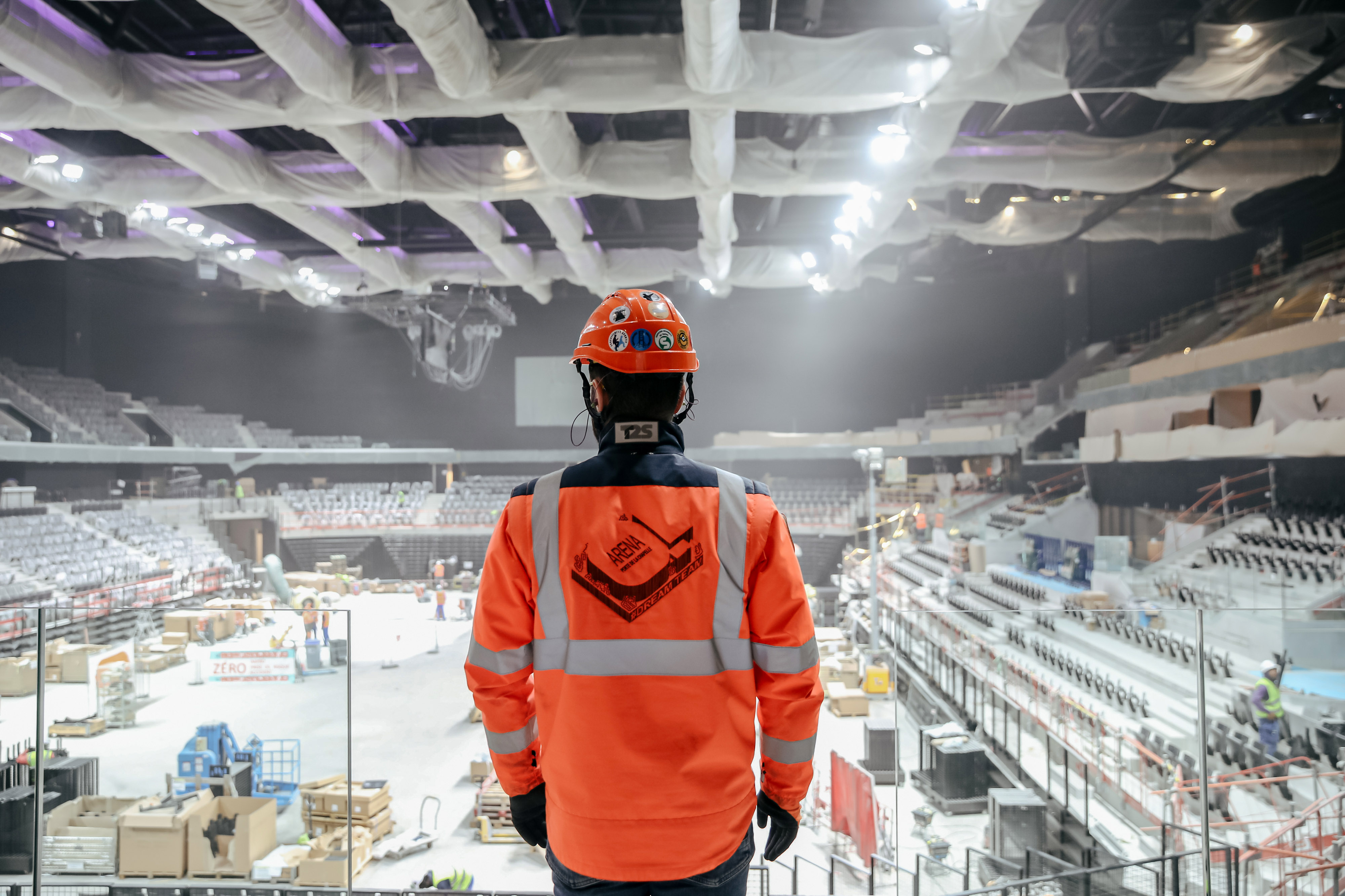 建筑工人们聚集在巴黎拉谢佩尔区的主会场Porte de La Chapelle Arena,也被称为阿迪达斯竞技场,时间是2023年11月21日星期二,那里将举办2024年夏季奥运会。