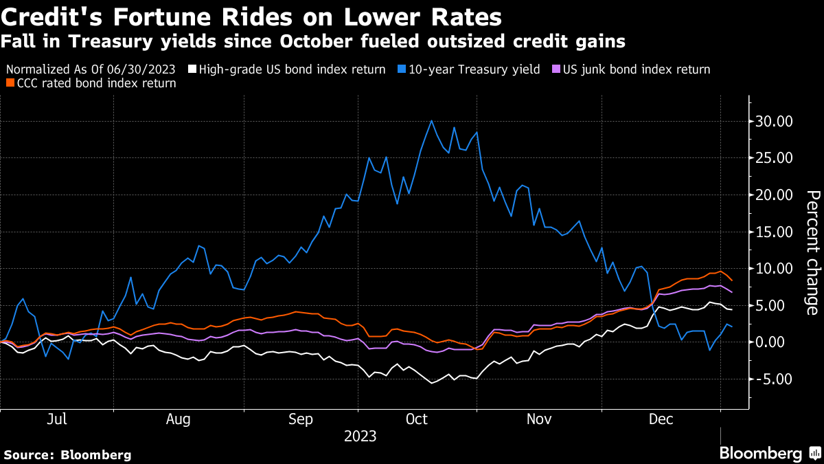 去年大部分信贷收益来自第四季度收益率的急剧下降。高评级和垃圾债券都被定价为完美,利差微乎其微,使它们容易受到美联储宽松政策带来的失望的影响。