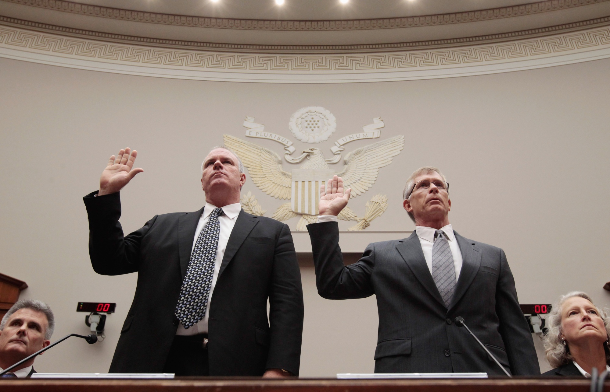 Solyndra首席执行官Brian Harrison和首席财务官Bill Stove在2011年的国会听证会上。摄影师:Chip Somodevilla / Getty Images几年后,审计长得出结论,Solyndra向能源部提供了“不准确和误导性”的信息,但也指责部门的尽职调查“不够有效”。 得出结论。