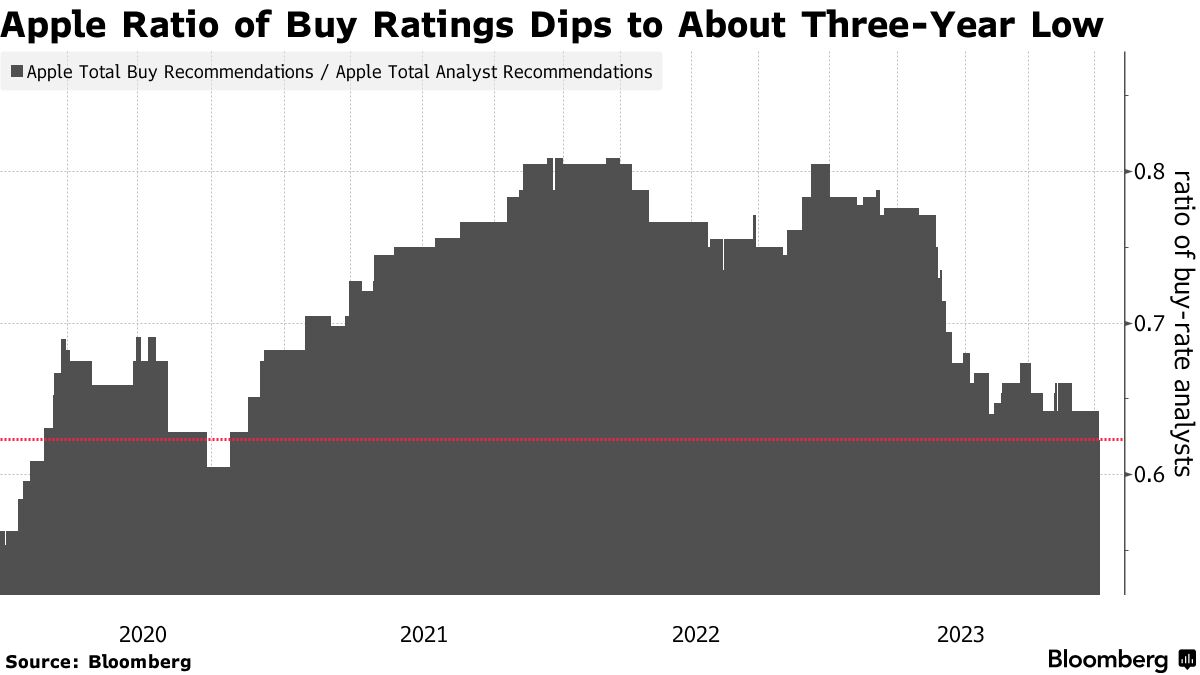 进入2024年,根据彭博社编制的数据,苹果已经是大型科技股中受到最少看涨推荐的公司。Piper Sandler的下调现在进一步将该公司的买入等价比率推低,分析师对该公司持看涨态度的比例降至三年来的最低水平。