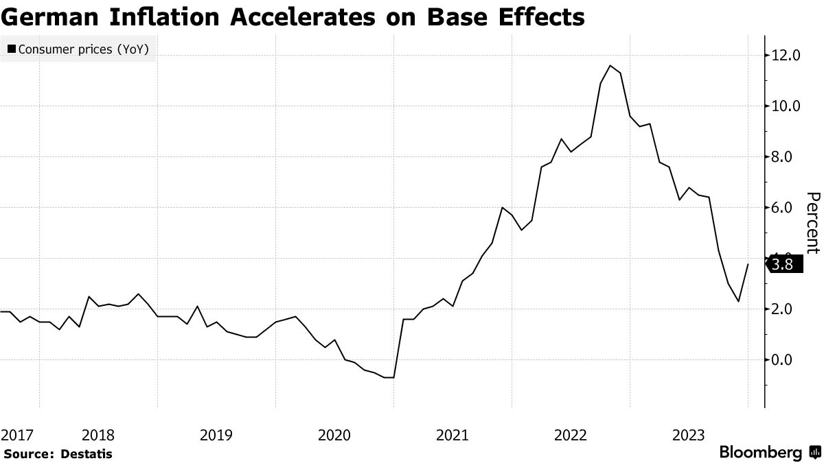 上个月的激增主要是基于基数效应:2022年底一次性国家援助降低了天然气和区域供热费用,一年后推高了通货膨胀。然而,近几个月来,电力、天然气和燃料价格下跌,德国地区数据显示这一趋势在12月持续。