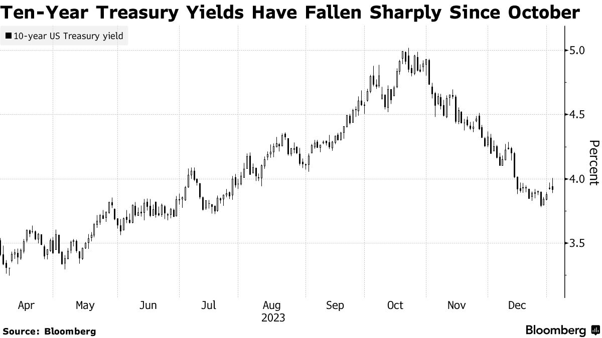 最近的涨幅将10年期国债收益率从10月的16年高点5.02%降至接近4%。与联邦储备政策前景最密切相关的两年期收益率约为4.4%,低于10月19日的5.26%的周期高点。