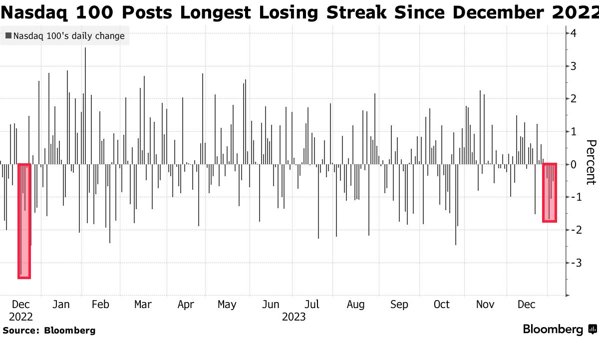 这些变动是在周四标普500指数连续第四天下跌的情况下出现的,而科技股重点纳斯达克100指数则连续第五天下跌,这是自2022年12月以来的最糟糕表现,表明去年的科技股赢家遭遇了卖压。这些损失使全球股市指数连续第三天下跌。